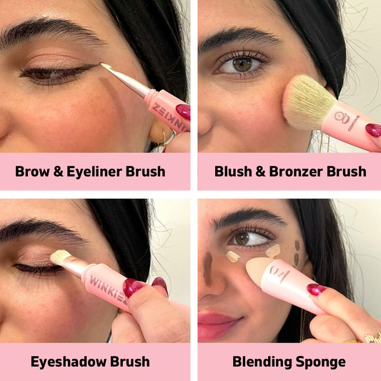 Our Winkiez makeup brush includes a concealer sponge, eyeshadow brush, eyeliner brush, and contour brush.